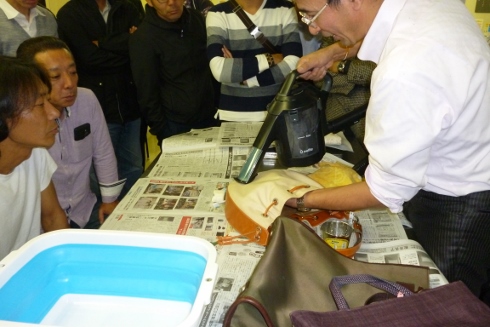 講習の要点は、靴・鞄をメニュー化するために、革の素材や加工に対応したみがき(メンテナンス)・クリーニング(丸洗い)・リメイク(色掛け)・リペア(修理)の知識と技術の習得すること。また、今回のメンテナンスは、お客様に安価にご提供できるサービスであることが分かりました。今後の講習も大変興味があります。参加者の皆様には長時間の講習、お疲れ様でした。